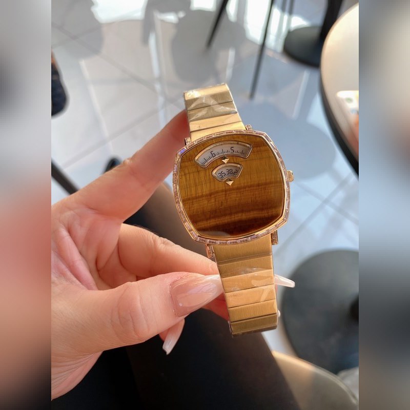 Decorated with artificial coral stones in soft tones, it highlights the noble and elegant atmosphere. Artificial agate stones interpret the new Grip series watch shape in the Epilogue series. The gemstone dial and the 44 step-cut diamonds inlaid are shining; this watch combines the timeless charm and extraordinary fashion style to create a unique design. Create a smooth and modern appearance, adding a luxurious atmosphere to the watch. With three windows showing hours, minutes and date respectively. With surprise functions, it captures every wonderful moment with you. Combining unique charm with super fashionable brand style, it has become the most fashionable highlight in the watch. In the spring when grass grows and warblers fly, let’s start a good time together.