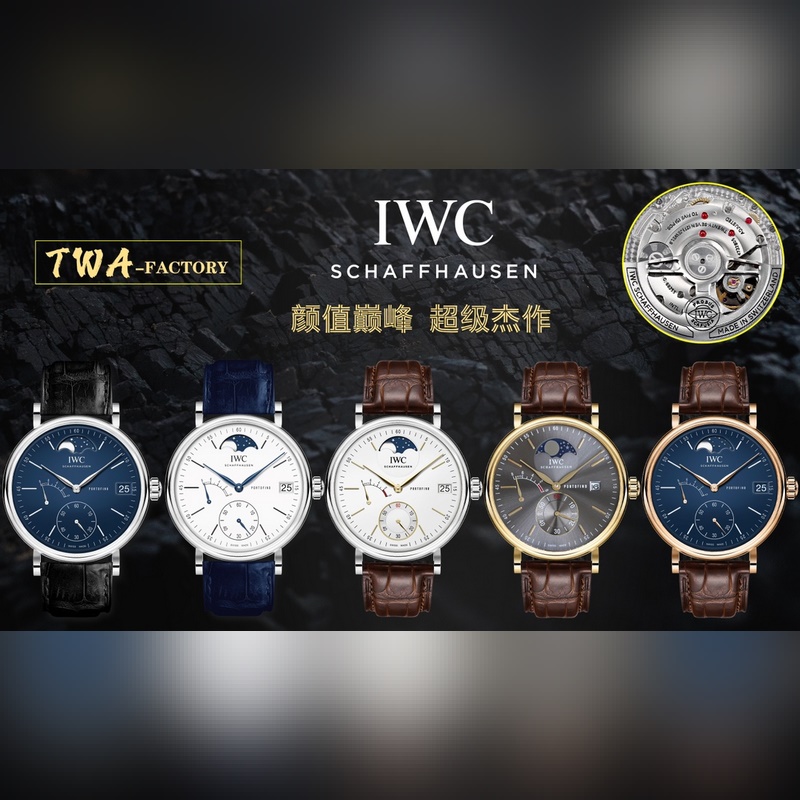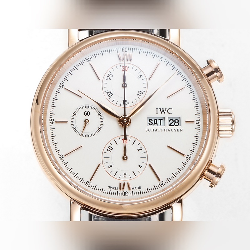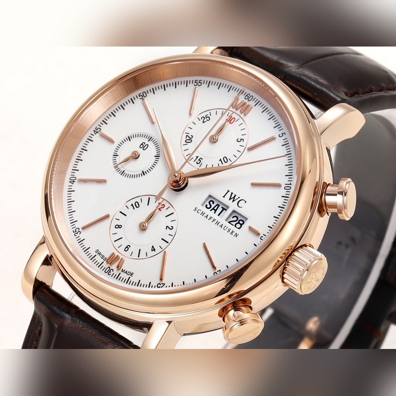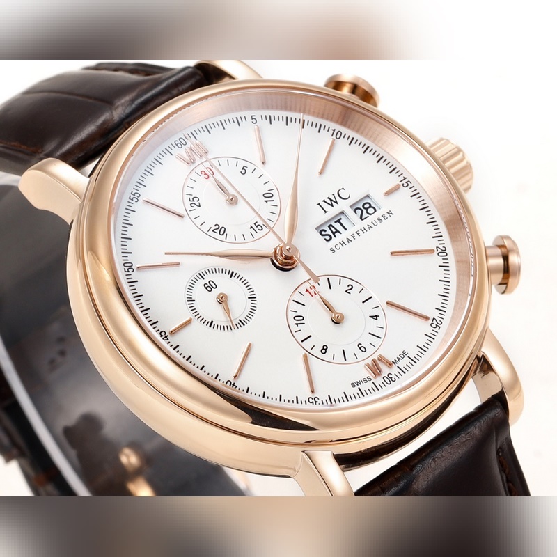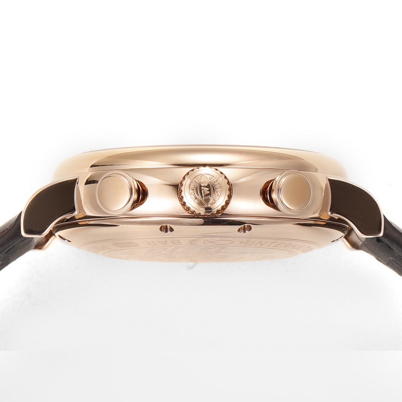 The IWC Portofino Chronograph has a size of 42mmX13.5mm. Perfectly in sync with the original, the case is made of stainless steel, and after careful polishing, it presents a delicate luster. The lugs have a natural curvature and are perfectly integrated with the case, with smooth lines and shining luster. The watch is equipped with a Shanghai 7750 modified 4601 automatic mechanical movement, which realizes all functions consistent with the original, a closed bottom design, an anniversary logo engraved on the bottom, and Italian calfskin with a pin buckle. It is easy to wear and has an excellent hand-held effect.